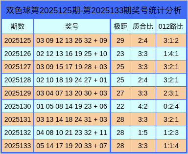 上期回顾:双色球第2025133期回顾:红球05、14、17、19、20、33 + 蓝球07。